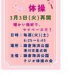 - ラジオ体操を3月3日(火)から再開します!2023年から若宮町内会有志の活動として始めたラジオ体操は、現在「鎌倉海浜公園 ラジオ… 続きを読む: ラジオ体操を3月3日(火)から再開します!