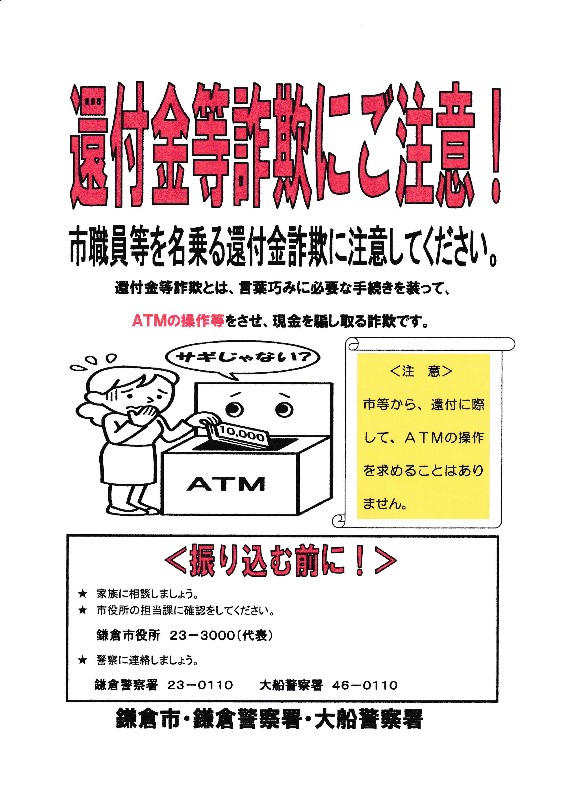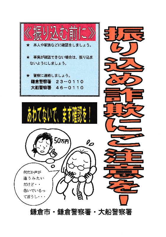 ◆鎌倉市ホームページの「特殊詐欺被害に遭わないために」に掲載されている注意喚起のチラシです。