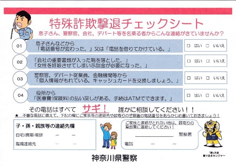 「火の用心!」「戸締り用心、火の用心!!」「お金の電話は振込詐欺!!!」