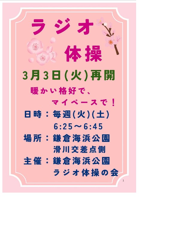 2023年から若宮町内会有志の活動として始めたラジオ体操は、現在「鎌倉海浜公園 ラジオ体操の会」主催に引き継がれて毎週火曜日と土曜日に行われています。